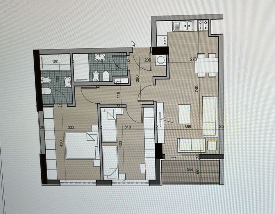 Квартира состоит из: гостиной и кухонной зоны, 2 спален, 2 ванных комнат, балкона, проходящего через всю квартиру.
